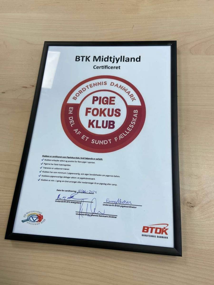 Vi har i løbet af året også fået anerkendelse fra Bordtennis Danmark i form af at være den første jyske klub, som har fået Bordtennis Danmarks certificering som Pigefokus klub.